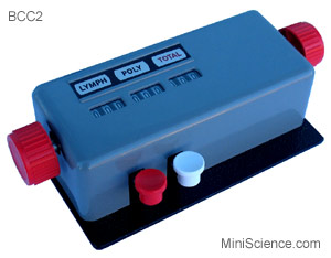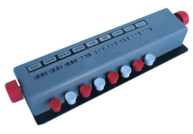 Blood cell counters are sensitive mechanical counters with metal base, shaft, springs and dividers. The keys, number wheels and gears are made of hard plastic. Dropping and mishandling blood counters can cause misalignment in the dividers and other internal components, resulting malfunction.