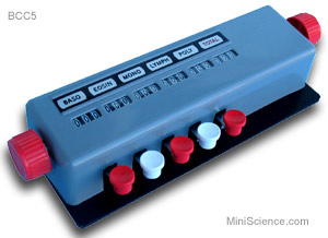Heavy-duty five-cell blood counter designed for differential cell counts in laboratory environments. Each key (BASO, EOSIN, MONO, LYMPH, POLY) records up to 999. Includes a totalizer that sums all five counts. A bell rings for every 100 total counts. Reset knobs on both sides allow complete zeroing of all cells. Red and white keys improve visibility and help prevent input errors. Constructed with a corrosion-resistant ABS shell for durability.